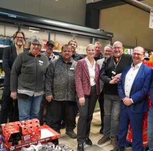 (v.l.n.r. Helmut Braun (Vorstand Dieter Kissel Stiftung), Steffen Strassel (Marktleiter Dahn), Klaus Nohr (Geschäftsführer learn by Breuer + Nohr), Rene Eichstädt (Mitarbeiter & Ansprechpartner für inklusive Kollegen des Edeka Kissel SBK Dahn), Ministerin Dörte Schall (Ministerin für Arbeit, Soziales, Transformation und Digitalisierung des Landes Rheinland-Pfalz), Florian Blesinger (Leitung Unternehmensentwicklung Kissel), Herr Hans-Peter Walk (Kollege Edeka Kissel SBK Dahn), Sascha Hirschinger (Kollege Edeka Kissel SBK Dahn), Melanie Schelenz (Kollegin Kissel SBK Dahn) und Marco Dobrani (Vorstand Heinrich Kimmle Stiftung))