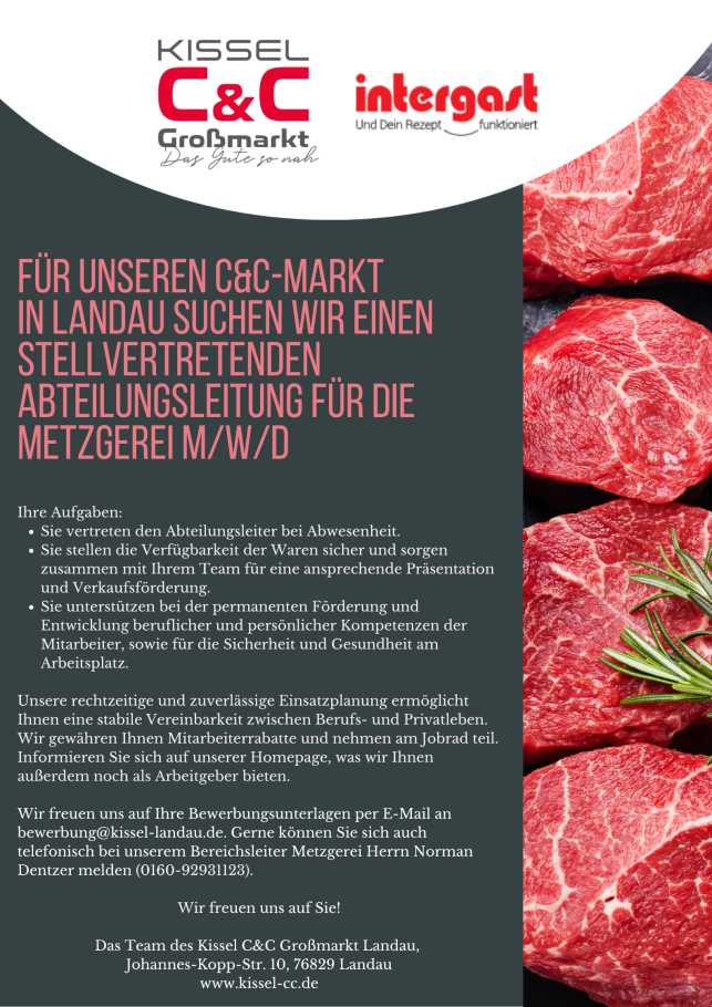 Gerne können Sie sich auch telefonisch bei unserem Bereichsleiter Metzgerei Herrn Norman Dentzer melden (0160-92931123).