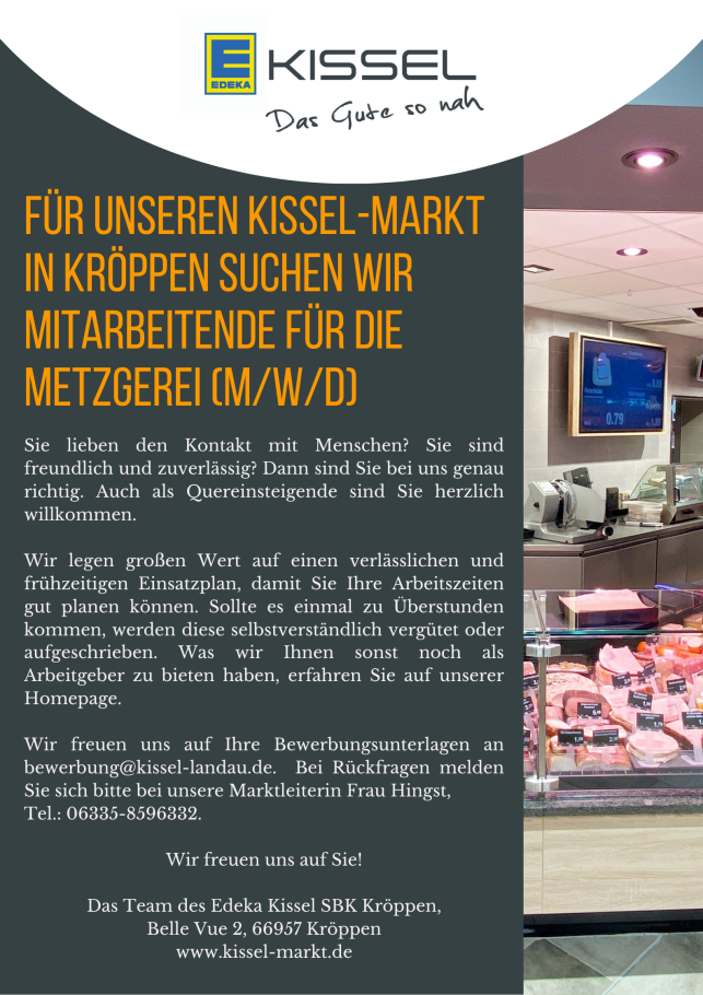 Bei Rückfragen melden Sie sich bitte bei unsere Marktleiterin Frau Hingst, Tel.: 06335-8596332.